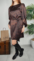 Abito in viscosa, stampa laser. Spalla a sbuffo, collo a barchetta. Cintura coordinata.
