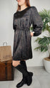 Abito in viscosa, stampa laser. Spalla a sbuffo, collo a barchetta. Cintura coordinata.