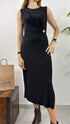 Abito con spalla larga ed arricciatura sulla vita e bottone d'orato. Spacco su un lato. Due taglie 38-42, 42-46.