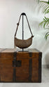 Borsa a mezza luna in nappa lisciata con impunture. Chiusura con zip.