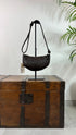 Borsa a mezza luna in nappa lisciata con impunture. Chiusura con zip.