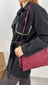 Borsa a busta in nappa lavorata ad intreccio medio largo su di un lato e liscio con tasca chiusa sull'altro. Chiusura con zip. Internamente tasca con zip su un lato.