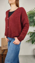 Cardigan taglio box, ampio scollo a V, chiusura a tre bottoni gioiello. Ottima vestibilità.