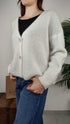 Cardigan taglio box, ampio scollo a V, chiusura a tre bottoni gioiello. Ottima vestibilità.